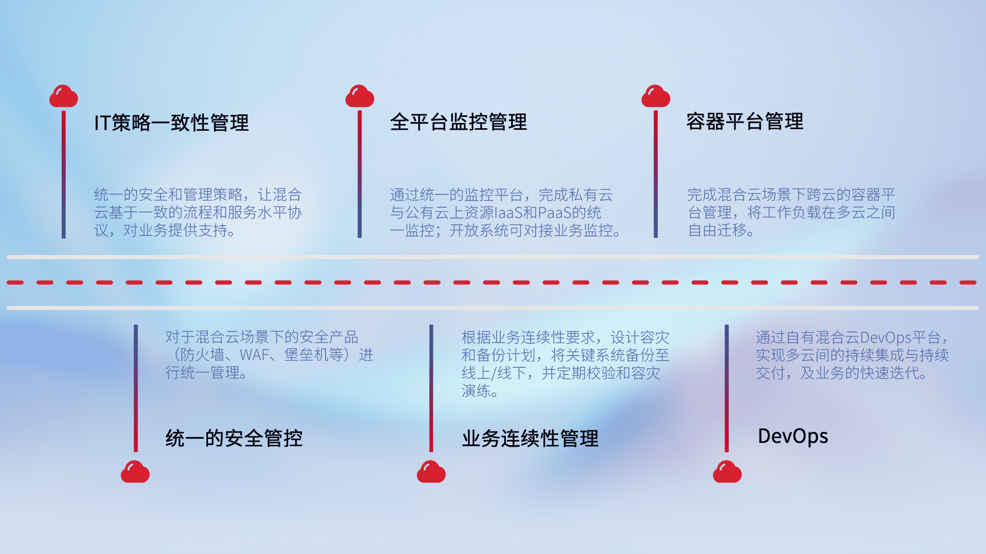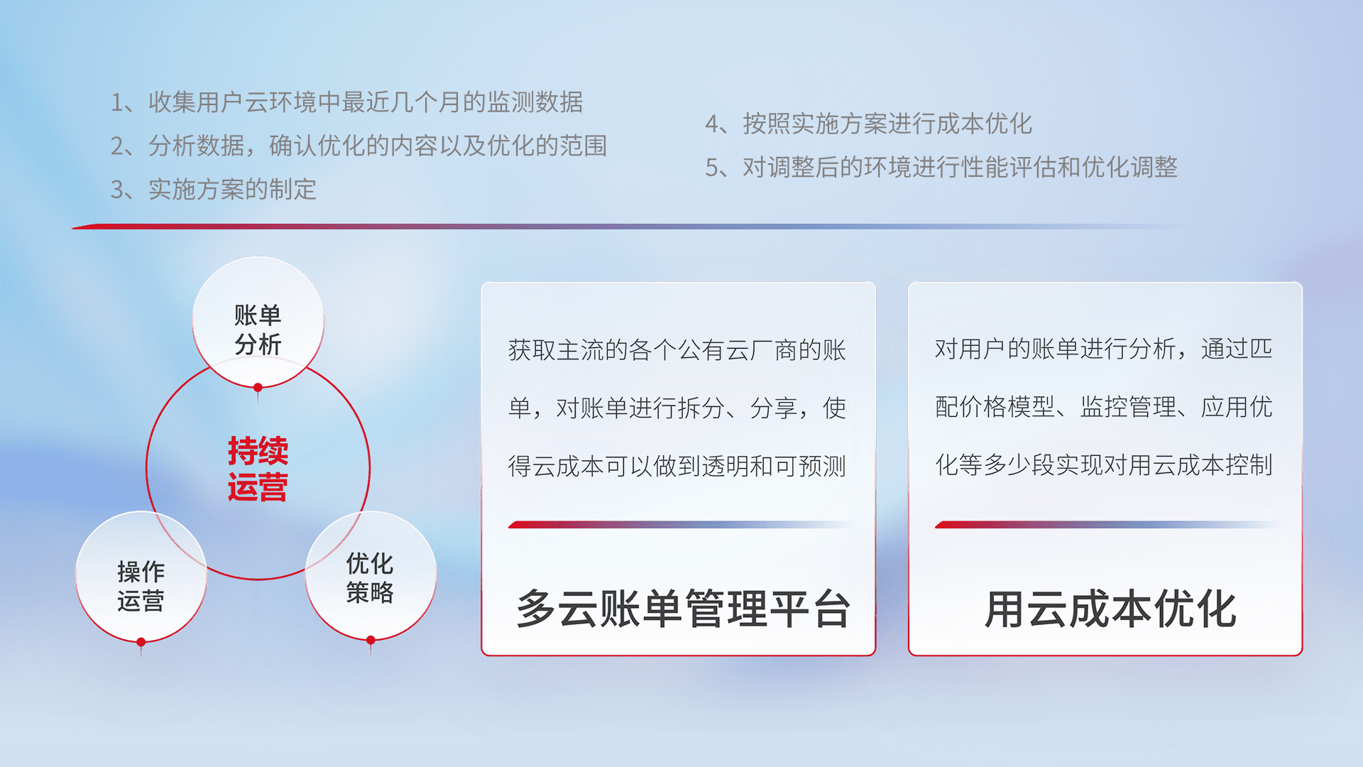 通过多云纳管,,以统一的资源数据模型把客户的云资源进行抽象和封装,,,,进而实现对多云资源的统一操作,,保障云资源管理的可靠性、、、稳定性与可用性。。量身定制化运维内容,,配置、、、开发运维、、补丁管理、、、、备份、、监控、、、、认证和访问管理、、审计和日常巡检等,,,,保障在用云过程中的可靠度,,,,稳定度以及高可用率。。。