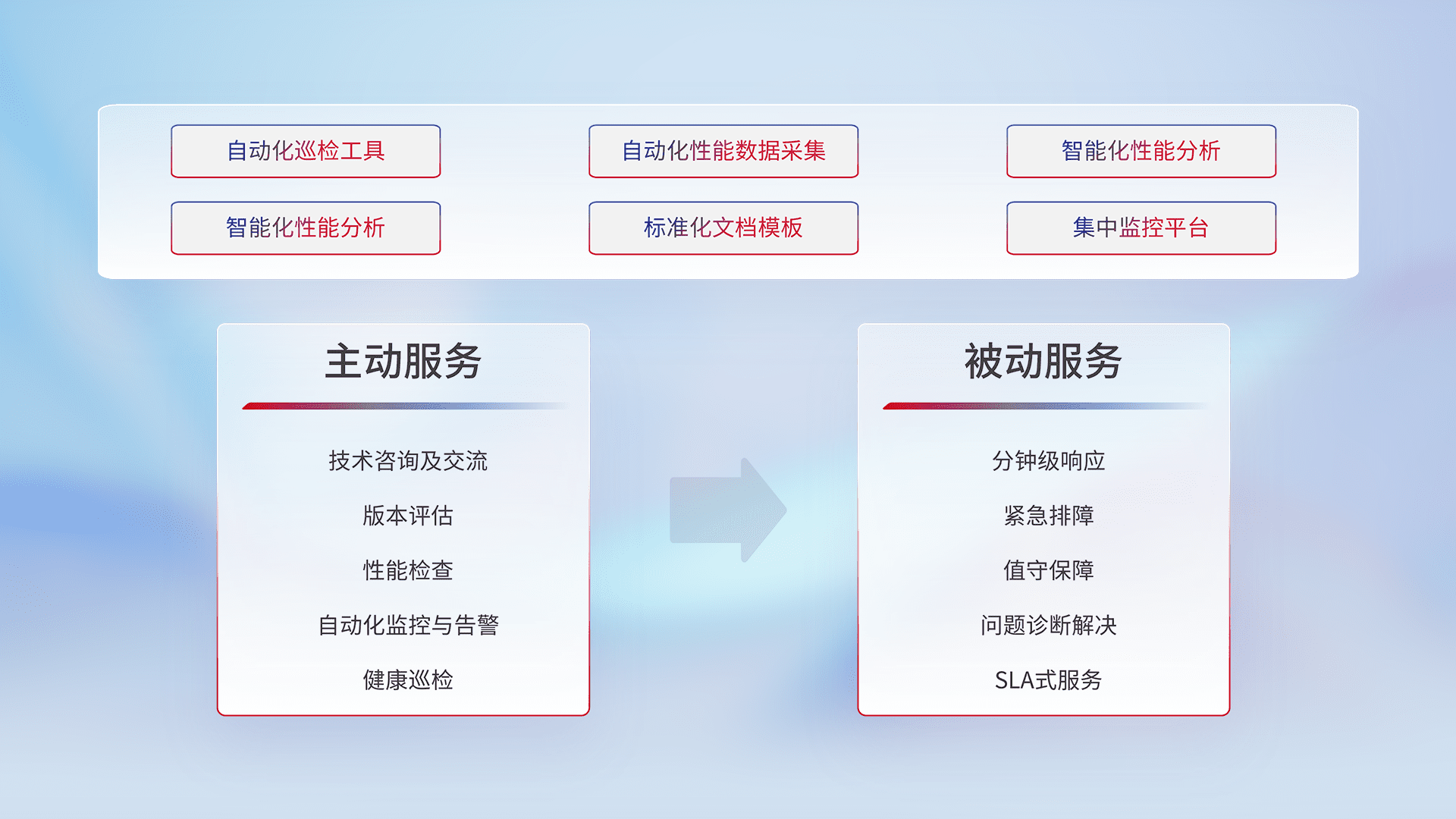 智能化工具和标准化文档,,,,保障服务质量,,,,提供主动服务(包含技术咨询、、、版本评估、、、、性能检查、、、、自动化监控与告警、、健康巡检)和被动服务包含(分钟级响应、、紧急排障、、、值守保障、、、问题诊断解决、、SLA服务)。。。。