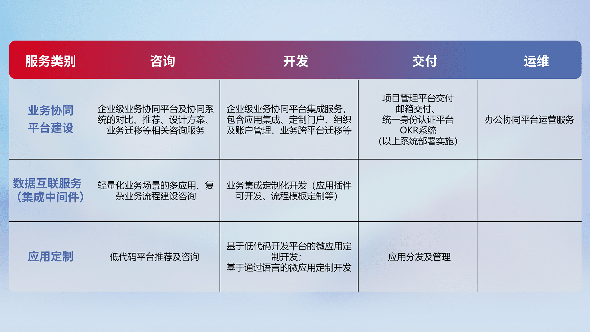 针对钉钉、、、企微、、、IDaas等平台级产品提供产品的规划、、、方案、、、交付、、、定制化开发等服务,,,,实现如统一协同办公、、、、智能客户服务、、、、混合会议管理、、、智能数据查询、、等业务场景,,,,实现数字化转型。。